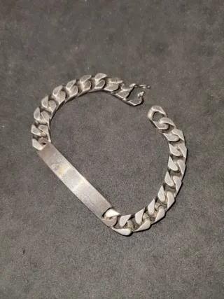Pulsera de Plata nueva. Tipica para grabar nombre. Tiene una longitud de 15.3 centimetros. Dispone de sellos de plata. Es una pieza muy bonita. Otras piezas en mi perfil. Toda la plata esta comprobada con acidos tenga sello o no. Plata, plateria, silver, joya, joyita, bjoux, argent, argentum, joyeria, antigua, anticuario, retro, vintage, y2k, 2000, pendientes, aros, argollas, pulsera, jonc, eslava, esclava, bilbaina, cubana, cadena, eslabón