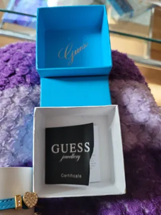Bonita pulsera de la marca Guess con un diseño encantador. - Pulsera con correa azul. - Detalle de corazón adornado con pequeñas piedras brillantes. - Elementos dorados. - Presentada en su caja original. Tiene algún roce