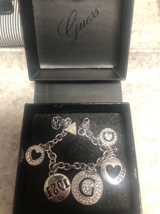 Preciosa colección de Guess en plata. Incluye un collar y una pulsera con encantos. Las piezas presentan un diseño elegante y delicado. -Cadena y colgantes con detalles grabados. -Cierre de mosquetón. No tengo la caja, son originales.