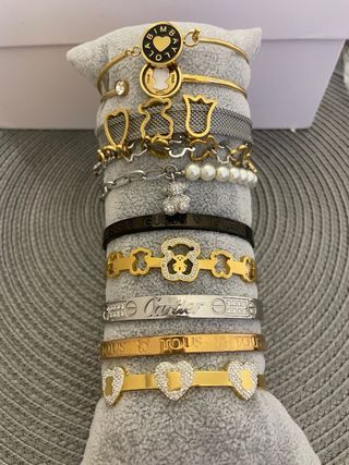 Preciosa colección de pulseras. ✨ - Juego de pulseras de acero inoxidable en tonos dorados y plateados. - Diseño elegante y sofisticado, ideales para cualquier ocasión. - Incluye dos juegos de pulseras: uno con dijes con letras y otro con diseño de perlas y charms. - Material resistente y duradero.