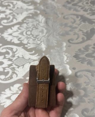 Reloj de pulsera con esfera negra y correa de tela marrón. - Esfera con números blancos. - Correa de tela. - Cierre de hebilla.