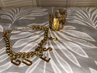 Precioso conjunto de collar y pulsera de la marca Guess. - Collar con eslabones gruesos y charm con letras. - Pulsera rígida con diseño calado. - Color dorado.
