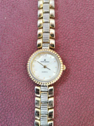 Elegante reloj de pulsera con un diseño bicolor. - Combinación de tonos dorados y plateados. - Esfera redonda con detalles. - Correa de eslabones.