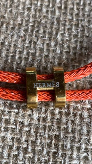 Pulsera de la prestigiosa marca Hermes con el icónico diseño de la H. - Acabado metálico dorado. - Cordón trenzado en color naranja vibrante.