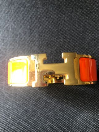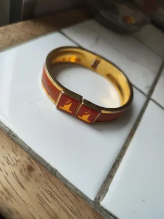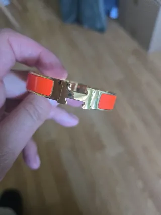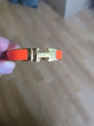 Elegante pulsera de la marca Hermes. - Diseño icónico con la letra H. - Combinación de colores naranja y dorado.