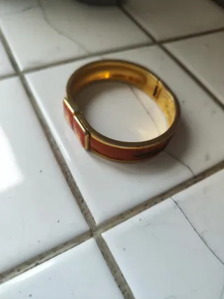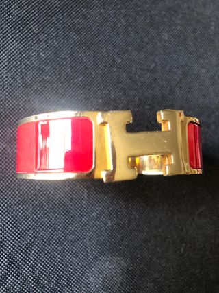 Pulsera de la prestigiosa marca Hermès con un diseño icónico. - Acabado metálico en tono dorado. - Detalle esmaltado en color rojo vibrante.