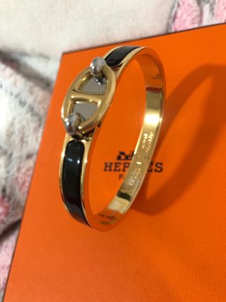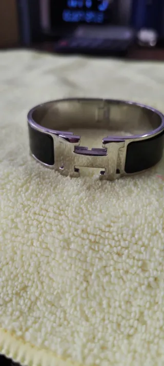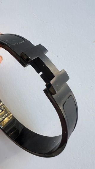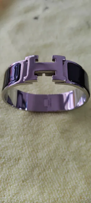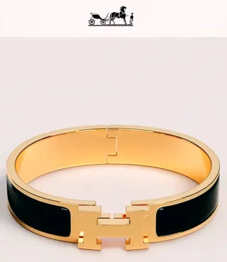 Elegante pulsera de la reconocida marca Hermès. - Diseño icónico con la letra H. - Acabado en esmalte negro y detalles dorados.