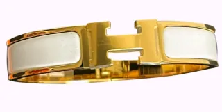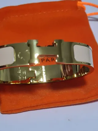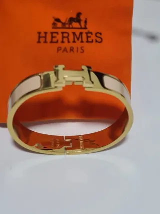 Elegante pulsera con el icónico diseño H de Hermès. - Acabado dorado. - Detalle en blanco. 10€ cada