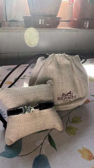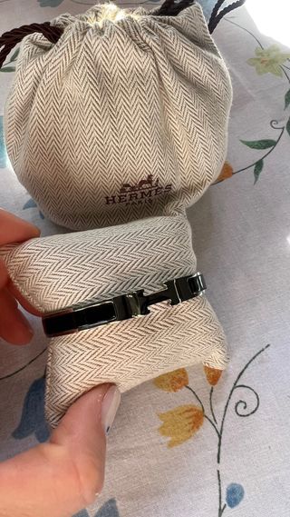 Pulsera Hermès con el icónico diseño H. - Diseño elegante en negro y plateado. - Cierre seguro y discreto.