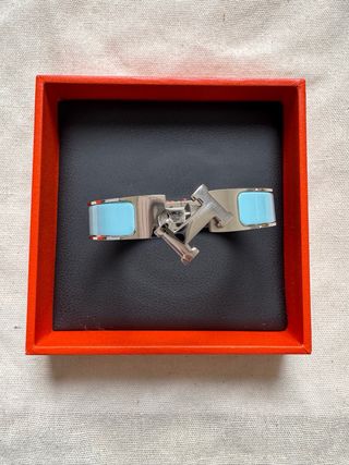 Pulsera tip marca Hermes. - Diseño icónico H. - Combinación de esmalte azul y tono plateado