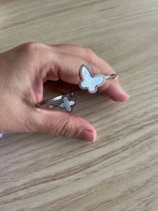 Elegante pulsera de acero inoxidable con motivos de mariposa y trébol. - Diseño abierto y ajustable. - Acabado plateado brillante. - Detalle en blanco nacarado.