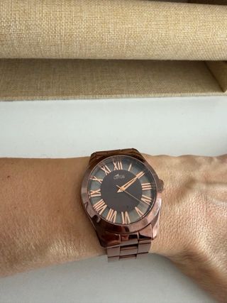 Elegante reloj de pulsera con un diseño moderno y sofisticado. - Esfera con números romanos. - Brazalete metálico. - Acabado en tono cobre.