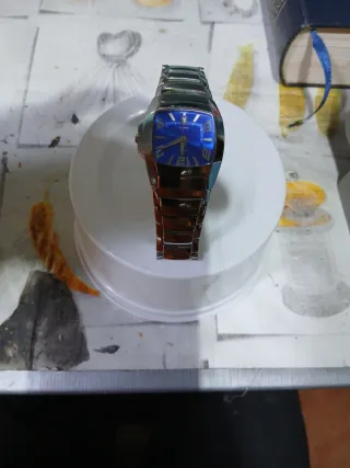 Elegante reloj de pulsera para mujer con una esfera azul vibrante y detalles plateados. - Diseño moderno y sofisticado. - Correa de eslabones metálicos. - Caja rectangular.