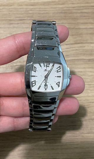 Elegante reloj de pulsera de la marca Lotus. Su diseño combina detalles plateados y una esfera oscura. - Brazalete de eslabones de acero inoxidable. - Caja rectangular. - Cierre de seguridad. - 19cm de diámetro (para muñecas estrechitas). La caja tiene una ligera imperfección (una pequeña manchita en el interior, visible en la última foto) por haber estado guardada, pero el artículo está intacto y funciona perfectamente."