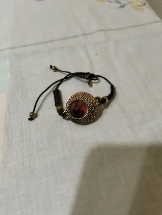 Pulsera con diseño ajustable y detalles en tonos dorados y marrones. - Cierre de cordón. - Detalle central circular. - Acabado metálico.