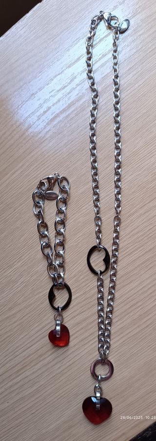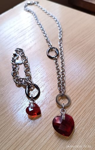 Preciosa joya Lotus compuesta por un collar y una pulsera. Ambas piezas presentan un diseño elegante y moderno. - Cadena de eslabones plateados. - Dos colgantes con forma de corazón rojo. - Cierre de tipo mosquetón. - Ideal para un look sofisticado.