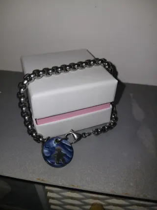Elegante pulsera de la marca Lotus con un diseño único. - Cadena de eslabones plateados. - Charm circular con detalles en azul y silueta. - Cierre de mosquetón.