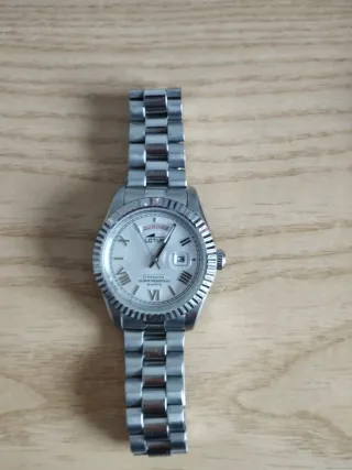 Elegante reloj de pulsera de la marca Lotus. Me costó 120 en nuevo centro, lo perdí y me compré el mismo pero ha aparecido, reloj en hora y en perfecto estado. Me encanta - Esfera blanca con detalles plateados. - Correa de eslabones metálicos. - Bisel con muescas.