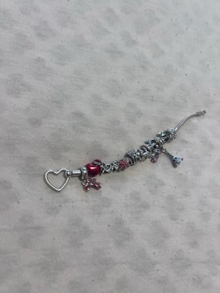 Pulsera Pandora original con 12 charms. - Charm de corazón plateado. - Charm de manzana roja. - Charm de la Torre Eiffel. - Charm de lazo rojo. - Charm con detalles rojos. Con su caja