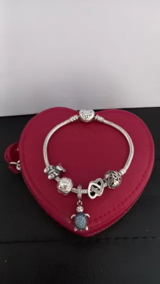 Conjunto original de Pandora salvo por la tortuga, es de plata pero no Pandora, aun así es preciosa - Pulsera 18 centímetros - Charm de oso. - Charm con detalles - Charm de corazón entrelazado. - Charm con diseño floral.
