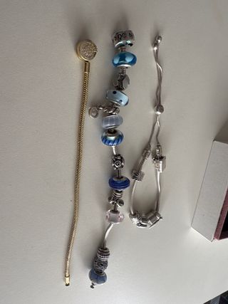 Conjunto de pulseras Pandora con varios charms. - Una pulsera dorada con un charm circular. - Una pulsera plateada con charms de diferentes diseños. - Una pulsera plateada con charms de cuentas azules y blancas. 925 plata