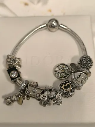 Pulsera de la marca Pandora con varios charms. - Charm de zapato de bebé. - Charm de copo de nieve. - Charm de Mickey Mouse. - Charm de bola con forma de piña. - Charm de pez. - Charm de cristal facetado.