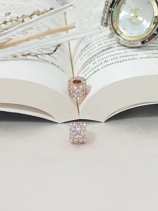Dos charms de estilo barril con un diseño delicado y brillante. Perfectos para añadir un toque de elegancia a tu pulsera. - Elaborados en oro rosa. - Decorados con circonitas transparentes y rosas.