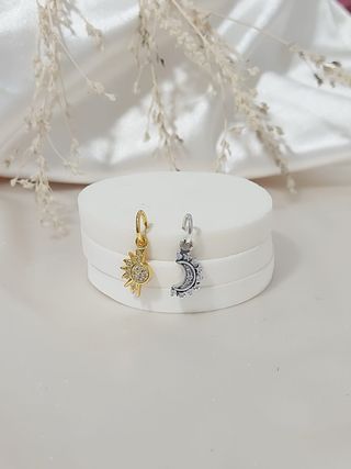 Set de dos colgantes para pulsera. - Un colgante con forma de sol y circonitas. - Un colgante con forma de luna y circonitas.