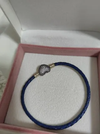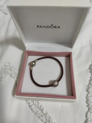 Preciosa pulsera Pandora de cuero trenzado en color rosa. Se encuentra en perfecto estado. No me la he puesto ni una vez. - Incluye dos vueltas de pulsera. - Cierre con detalles metálicos. - Tiene incluido un charm de ángel.