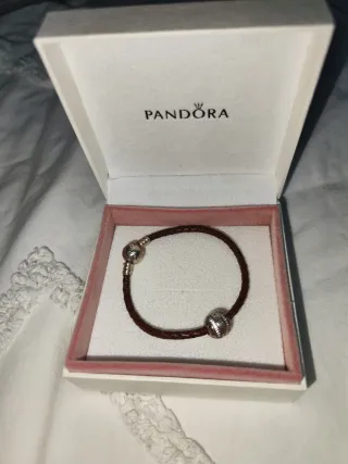 Pulsera de cuero con abalorios de la marca Pandora. - Diseño con cordón tambien de Pandora - Incluye abalorios de plata.