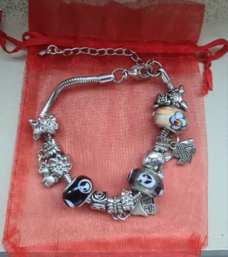 Bonita pulsera con varios charms y cuentas, tres de ellos con la marca de plata 925. - Diseño tipo Pandora. - Cierre de mosquetón. - Incluye charms de animales y flores.