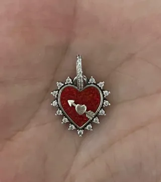 Este encantador charm de Pandora presenta un diseño de corazón rojo vibrante, atravesado por una delicada flecha plateada. Está adornado con pequeñas circonitas brillantes alrededor del borde, añadiendo un toque de elegancia. - Diseño de corazón con flecha. - Detalles de circonitas.