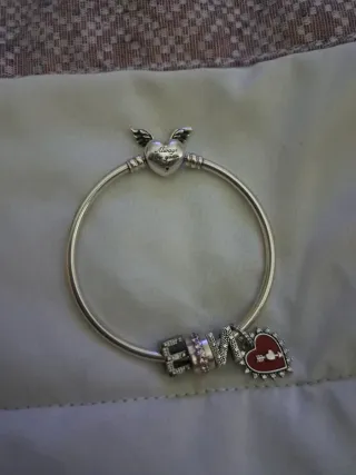 Pulsera de plata de la marca Pandora ,completa con varios Charm El cierrede seguridad es un corazón con alas. Tiene: - Un charm con forma de corazón de color rojo y piedritas brillantes Dos letras de plata con brillo . La letra N y la letra E - Cierre de corazón con detalles. - Tope Adorno con pequeñas piedras rosas. Si interesa tambien se venden los charm x separado . Se vende tambien la pulsera sola 45€ 150 € Pulsera Entera (incluidos charm)