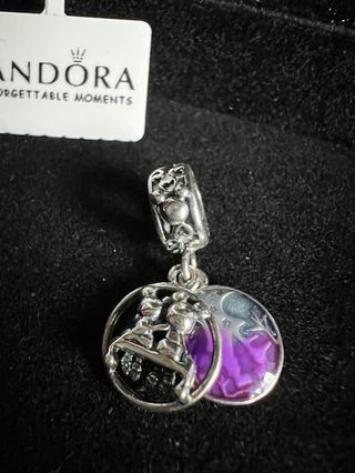Este charm de Pandora presenta a Mickey y Minnie Mouse en un diseño encantador. - Diseño de doble colgante. - Detalle de esmalte morado vibrante. - Plata de ley.