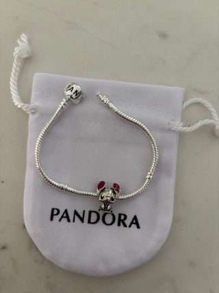 Pulsera de la marca Pandora con charm de Stitch. - Charm de Stitch con detalles en rosa. - Pulsera tipo serpiente. - Cierre de seguridad.