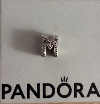 Charm de la marca Pandora con diseño de la letra M. Presenta un acabado detallado con pequeños corazones. - Diseño de letra M. - Detalles de corazones. - Color plateado.