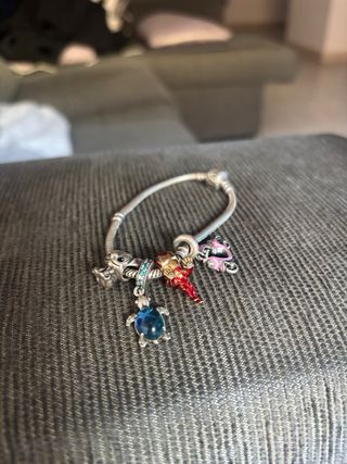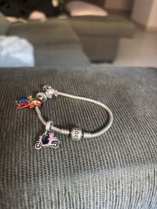 Se vende Pulsera Pandora junto con 4 Charms originales de pandora: - Charm Colgante Tortuga Marina - Charm Colgante en Plata Moto Scooter Rosa - Charm Iron Man Los Vengadores de Marvel - Charm Lilo y Stitch de Disney Posibilidad de vender los Charms individualmente a 20€ cada uno o escucho ofertas!