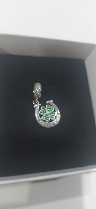 Charm de plata 925. Ideal pulsera pandora. Herradura y trébol de la suerte verde. Nuevo a estrenar.