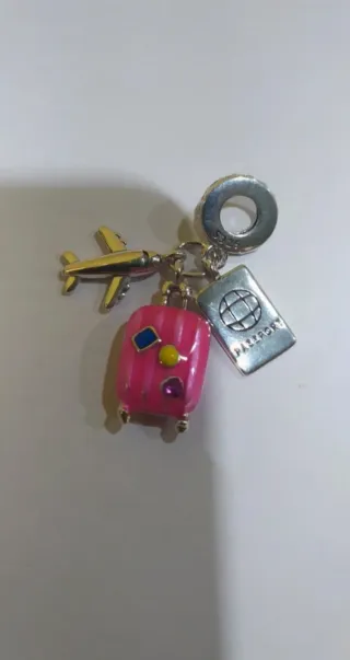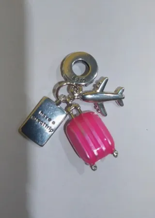 Charm de plata 925. Ideal pulsera pandora. Avión, maleta y pasaporte rosa. Nuevo a estrenar.