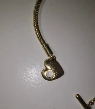 Elegante pulsera de la marca Pandora con un diseño de corazón. - Acabado en tono dorado y plateado. - Corazón adornado con pequeñas piedras brillantes. - Detalle de una piedra redonda y transparente. - Cierre de pulsera.