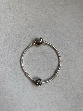 Elegante pulsera Pandora con dos charms. - Charm en forma de corazón plateado. - Charm con diseño de nudo infinito plateado. - Pulsera tipo cadena de serpiente plateada. - Sin usar