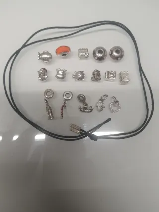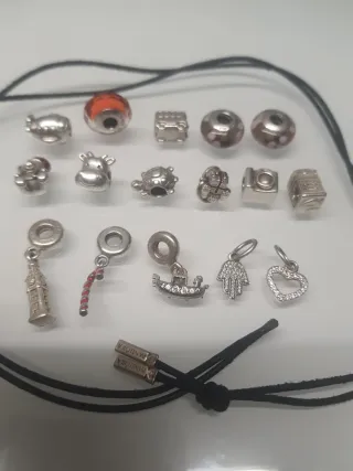 Conjunto de bisutería de la marca Pandora. Original. - Collar que tambien se hace pulsera de cordón negro. - Varios charms Dime qué es lo que te interesa y te hago precio. Colgante 10. Charms a 9 euros. Hago precio por lotes.