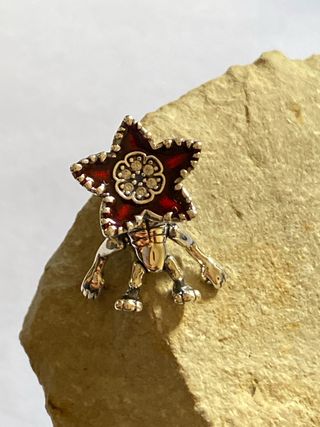 Charm de plata de ley con un diseño inspirado en el Demogorgon de Stranger Things. El detalle en rojo y los pequeños cristales le dan un toque único. - Material: Plata de ley. - Diseño: Demogorgon. - Acabado: Esmalte rojo y cristales.