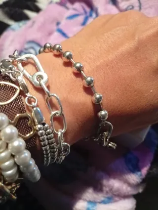 Conjunto de varias pulseras con diferentes diseños. - Pulsera con cuentas plateadas y detalle central. - Pulsera de perlas blancas. - Pulsera con eslabones plateados y charm de trébol. - Pulsera dorada con cadena. - Pulsera fina de perlas blancas.