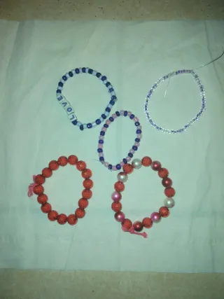 Conjunto de pulseras hechas a mano con cuentas. - Pulsera con cuentas rojas y detalle de hilo rosa. - Pulsera con cuentas rojas y rosas, y detalle de hilo rosa. - Pulsera con cuentas moradas y blancas, con letras LOVE. - Pulsera con cuentas moradas y rosas. - Pulsera con cuentas transparentes y moradas.