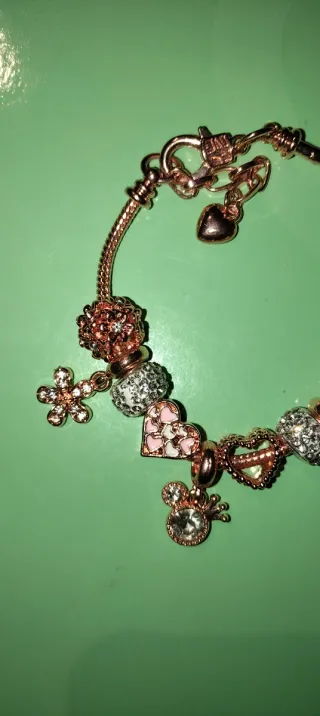 Pulsera ajustable con varios charms. - Diseño tipo Pandora. Precio charm de Mickey con corona y brillantitos, mas flores y corazones,separadores de cuentas - Acabado en tono dorado y rosa. Ideal para regalos, tamaño niña y adulto