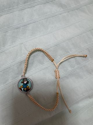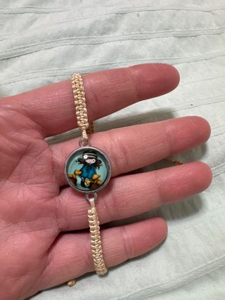 Pulsera con un charm de una niña con abrigo azul y animalitos. - Diseño de macramé. - Charm con imagen de personaje. - Cierre ajustable.