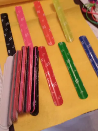 Lote de cien pulseras flexibles de tipo click clack. Son ideales para fiestas, eventos o para que los niños jueguen. - Variedad de colores. - Diseño con motivos decorativos. Producto nuevo a estrenar. Set de 100 unidades de pulseras clic clac para fiestas y cumpleaños, para jugar y para contraseñas de eventos. Atendemos los siete dias de la semana y hacemos envios por Wallapop. Kalobi
