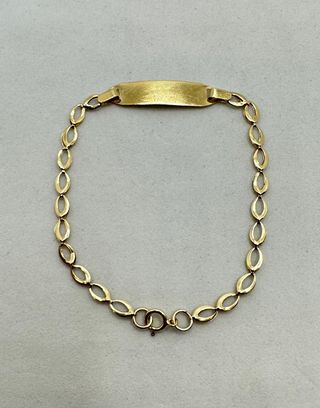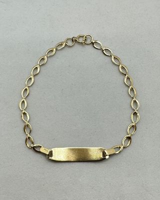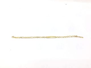Preciosa pulsera de oro de 18k para niña. Es una pulsera fina y delicada, ideal para una ocasión especial o uso diario. - Material: oro de 18k - Diseño: cadena fina con placa rectangular grabada.