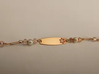 Lo que muestras en las imágenes es una pulsera de bebé en oro con perlitas, un diseño clásico y delicado muy común como regalo de bautizo, nacimiento o primer cumpleaños. Detalles observables: • Material: La plaquita lleva un sello grabado (en la primera foto), lo cual suele indicar el contraste del oro y a veces la marca del fabricante. Aunque la imagen está algo borrosa, parece un contraste de oro de 18K (750 típico en joyería fina en España e Italia. • Diseño: Alterna eslabones de oro con pequeñas perlas cultivadas redondas, lo que le da un aire elegante y tierno. • Uso: Pulsera pensada para bebé/niña, ligera.Referencia:7509